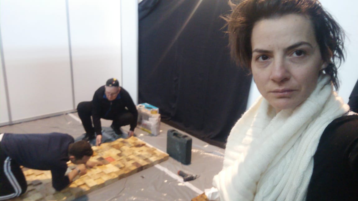 Pezana dhe kolegët duke montuar mobiljet për panair