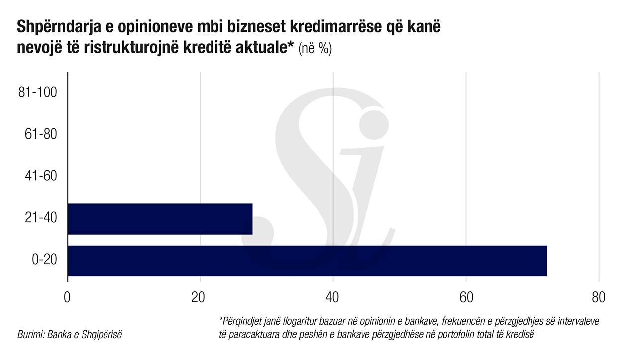 Tetë prej nëntë bankave që morën pjesë në pyetësor, të cilat zotërojnë rreth 72% të totalit të kredisë akorduar bizneseve, raportuan se pjesa e klientëve të tyre të cilit kishin nevojë për ristrukturim, apo kishin ristrukturuar kreditë aktuale, luhatet në intervalin 0-20%. Ndërkohë, një bankë u shpreh se klientët e saj që kishin nevojë për të ristrukturuar kreditë aktuale luhateshin në intervalin 21-40%.