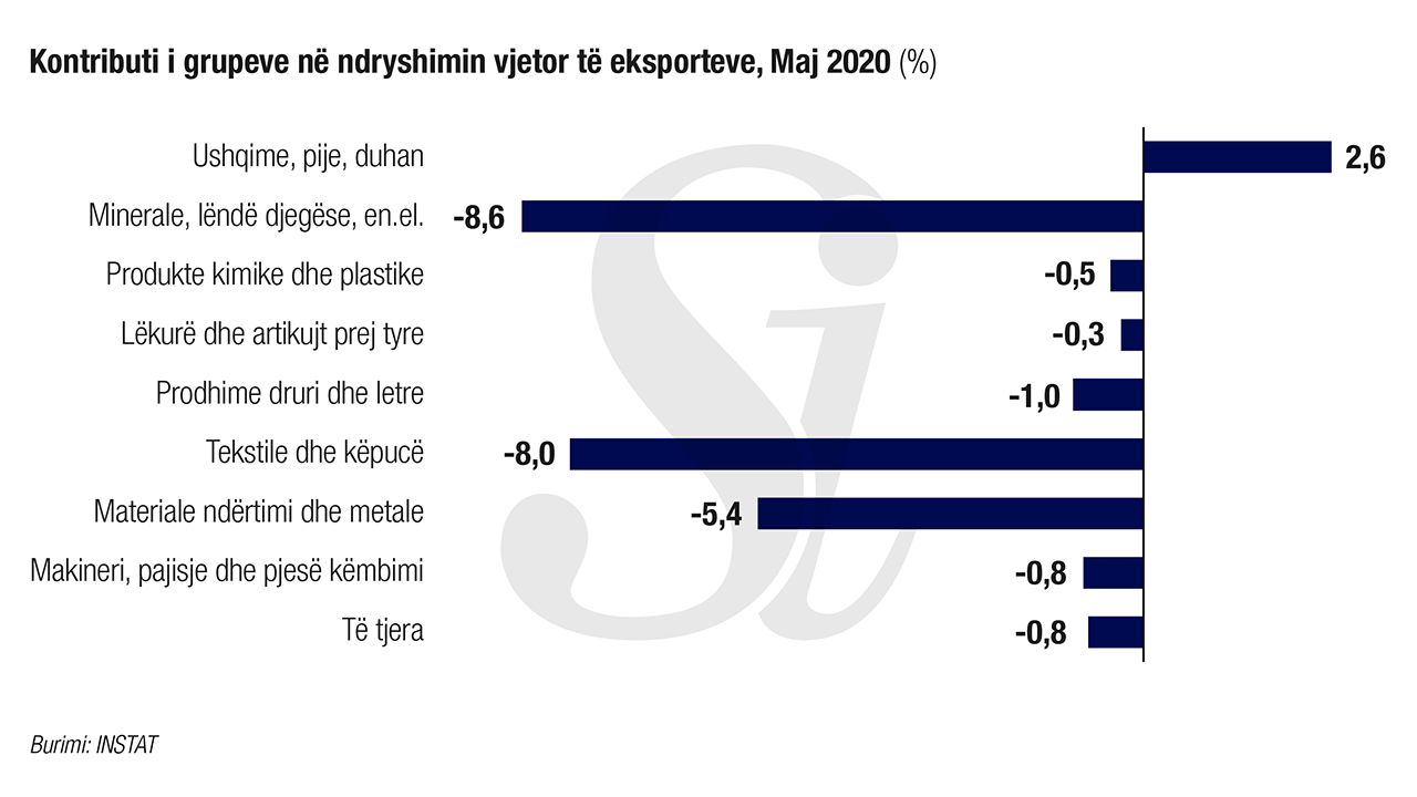 Sipas INSTAT, grupet që kanë ndikuar negativisht në uljen vjetore të eksporteve, janë: “Tekstile dhe këpucë” me -10,1 pikë përqindje, “Materiale ndërtimi dhe metale” me -5,1 pikë përqindje, “Minerale, lëndë djegëse, energji elektrike” me -3,4 pikë përqindje.