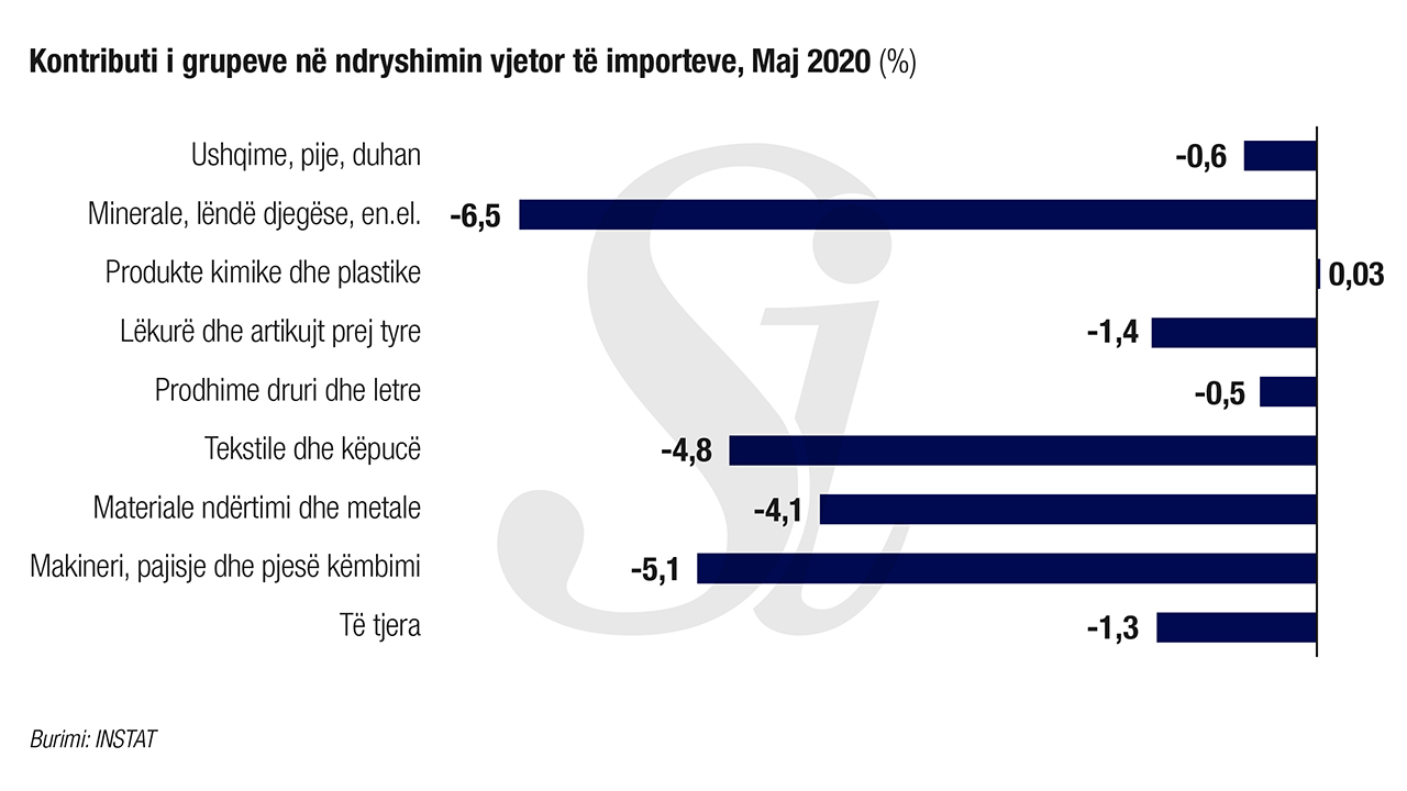 Rënia vjetore e importeve prej 24,2 %, këtë muaj është ndikuar kryesisht nga grupet: “Minerale, lëndë djegëse, energji elektrike” me -6,5 pikë përqindje, “Makineri, paisje dhe pjesë këmbimi” me -5,1 pikë përqindje, “Tekstile dhe këpucë” me -4,8 pikë përqindje. Në ndryshimin vjetor të importeve ka ndikuar pozitivisht grupi: “Produkte kimike dhe plastike” me +0,03 pikë përqindje.