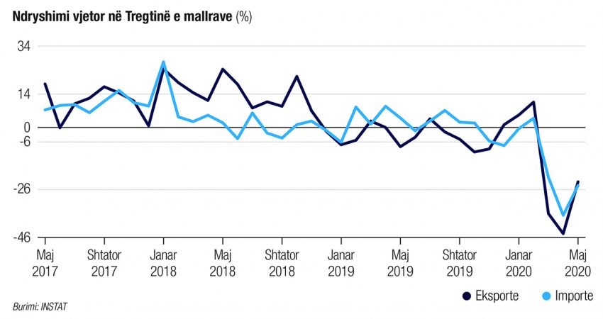 Instituti i Statistikave ka raportuar këtë të mërkurën se në pesëmujorin e parë 2020 eksportet e mallrave arritën vlerën e 102 mld lekëve, duke u ulur me 19,4 %, krahasuar me një vit më parë dhe importet e mallrave arritën vlerën 219 mld lekë, duke u ulur me 17,1 %, krahasuar me një vit më parë. Deficiti tregtar arriti vlerën 117 mld lekë, duke u ulur me 14,9 %, krahasuar me të njëjtën periudhë të 2019.