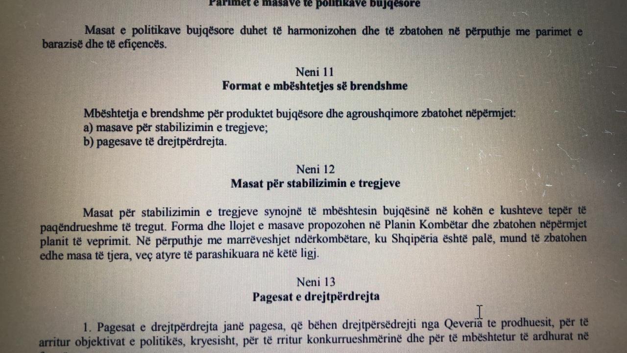 Edhe ligji në fuqi për bujqësinë parashikon masa për stabilizimin e trgjeve që synojnë të mbështesin bujqësinë në kohën e kushteve të paqëndrueshme të tregut. Format dhe llojet e masave sipas ligjit propozohen në Planin Kombëtar, që sipas Sharkës nuk ekziston një i tillë.