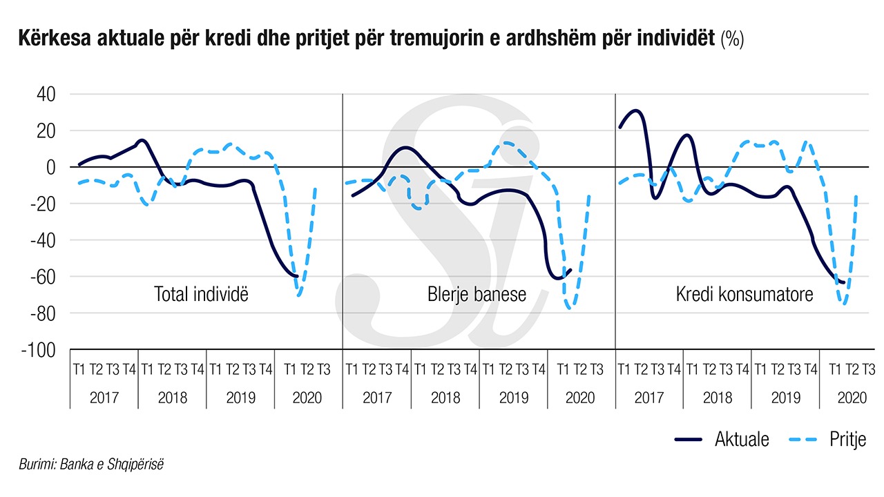 Po ashtu edhe standardet e kreditimit për individët vijuan shtrëngimin edhe në tremujorin e dytë të vitit 2020. Standarde të shtrënguara kreditimi u raportuan si në kreditë për blerje banesash, ashtu edhe në ato për financimin e konsumit. Në tremujorin e tretë të vitit 2020, bankat presin t’i lehtësojnë standardet e kreditimit për individët, si në kreditë për blerje banese, ashtu edhe ato konsumatore.