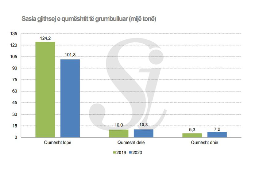“Gjatë kësaj periudhe, sasia e qumështit të lopës të grumbulluar është rreth 101 mijë tonë, duke pësuar rënie me 18,45%, krahasuar me 2019. Sasia e grumbulluar e qumështit të deles, në vitin 2020 është rreth 10 mijë tonë, duke shënuar rritje me 3,07%, krahasuar me një vit më parë.