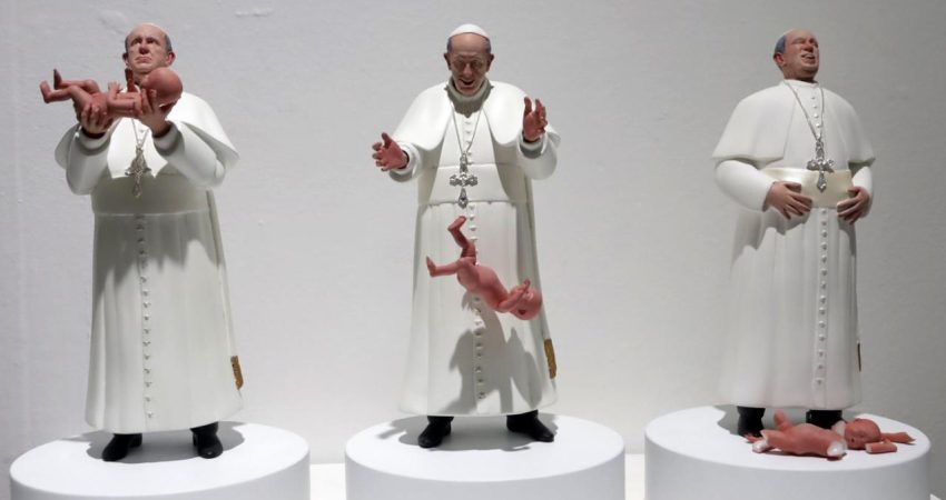 Nga Gazeta Si – Një skulpturë në tri akte: figura e Papës që mban në krahë një foshnjë të porsalindur, më pas e lëshon atë dhe më pas qesh duke e parë copë-copë te këmbët e tij. Vepra e artit e artistit kilian Pablo Maire po shkakton jo pak polemika. Një vepër përdhosëse, një denoncim për Kishën Katolike “që përjetëson, – sipas autorit, – një model të dhunshëm dhe anakronik”.