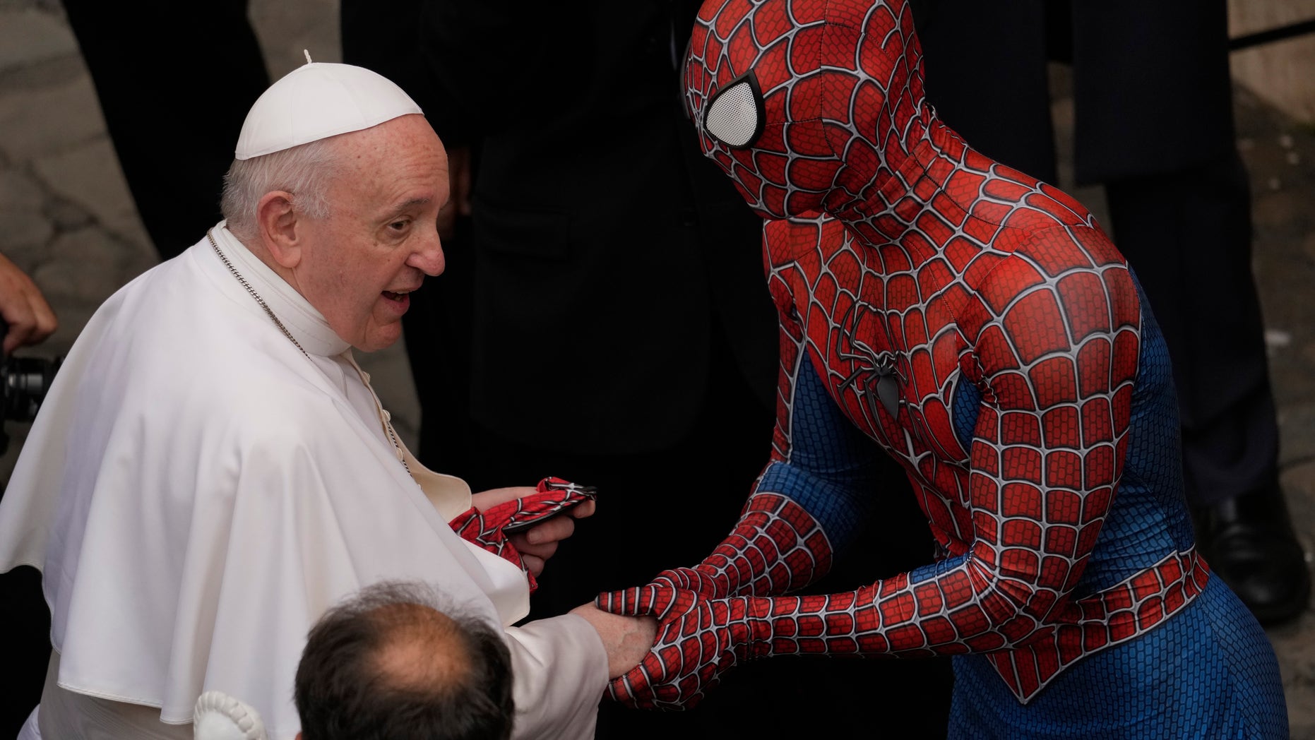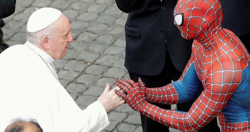 Papa Françesku përshëndet një person të veshur si SpiderMan, i cili gjendej në Vatikan për t’i dhuruar Papës një maskë të SpiderMan të bërë enkas për të.\Reuters\
