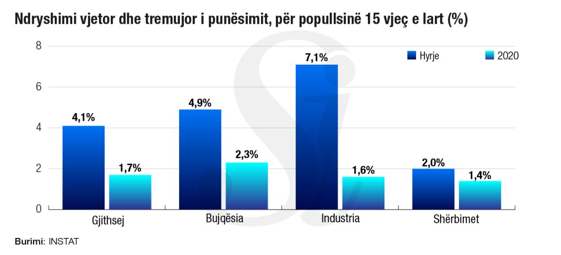 Në terma vjetorë, punësimi është rritur me 7.1 % në sektorin e industrisë, me 2.0 % në sektorin e shërbimeve dhe me 4.9 % në sektorin e bujqësisë.