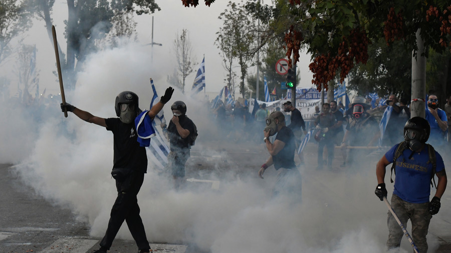 Protestues greke me maska antigaz gjate nje tubimi te dhunshem ne Selanik