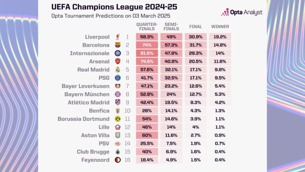 Përqindjet sipas “Opta” për triumfin në Champions League