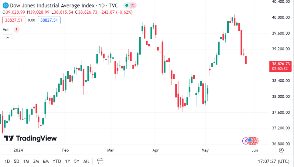 Për sa kohë DOW JONES do të tregtohet mbi vlerën 38900 trenda do të jetë pozitive me target 39300-39450. Tregtimi nën vlerën 38900 hap rrugën për testimin e suportit 38400