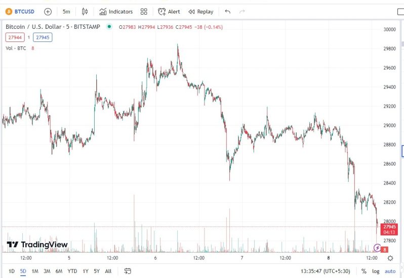 Për sa kohë BTC/USD tregtohet mbi 27970 trenda do të jetë pozitive me target 31550. Tregtimi nën 27970 do pasohej nga thellimi i rënies drejt suportit 25670.