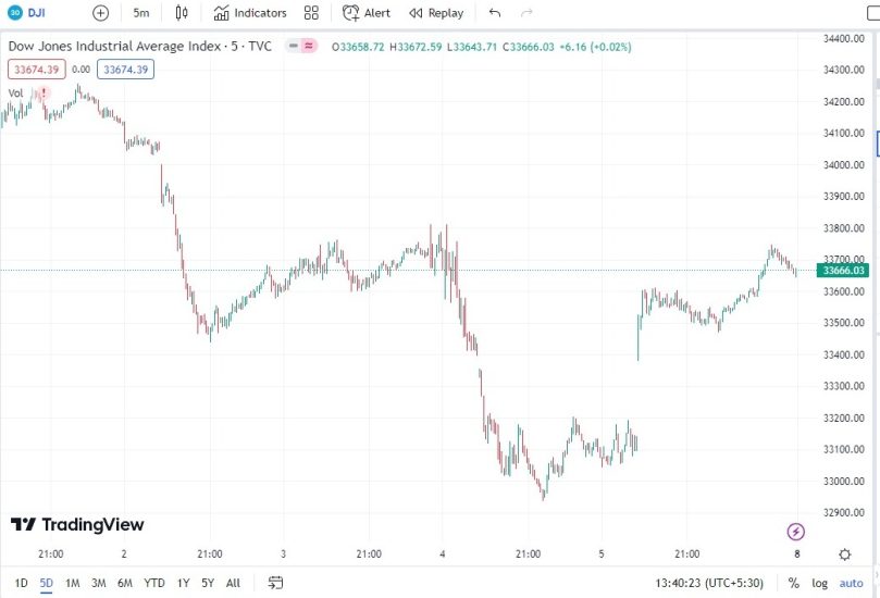 Për sa kohë DOW JONES tregtohet nën vlerën 33740 trenda do të jetë negative me target 33380 dhe më pas 33075. Tregtimi mbi vlerën 33740 do të pasohej nga avancimi drejt targetit 33950 dhe më pas 34260.