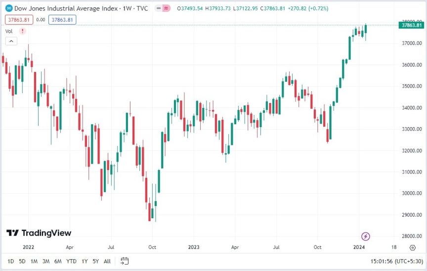 Për sa kohë DOW JONES do të tregtohet mbi vlerën 37770 trenda do të jetë pozitive me target 38600. Tregtimi nën vlerën 37770 do të pasohej nga tentativa e testimit të suportit 37380