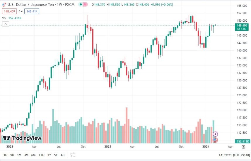 Për sa kohë USD/JPY do të tregtohet mbi vlerën 148.23 trenda do të jetë pozitive me target 149.46  pas së cilës reagimi pritet të jetë negativ. Tregtimi nën vlerën 148.23 do të pasohej nga testimi i suportit 146.9