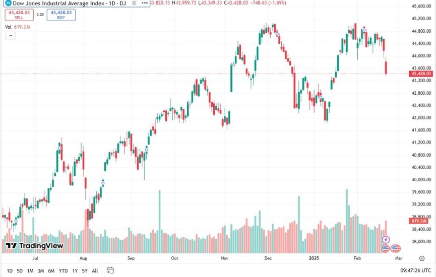 Për sa kohë DOW JONES do të tregtohet nën vlerën 43550 trenda do të jetë rënëse me objektiv 42150. Tregtimi mbi vlerën 43550 hap rrugën për testimin e rezistencës 43750.