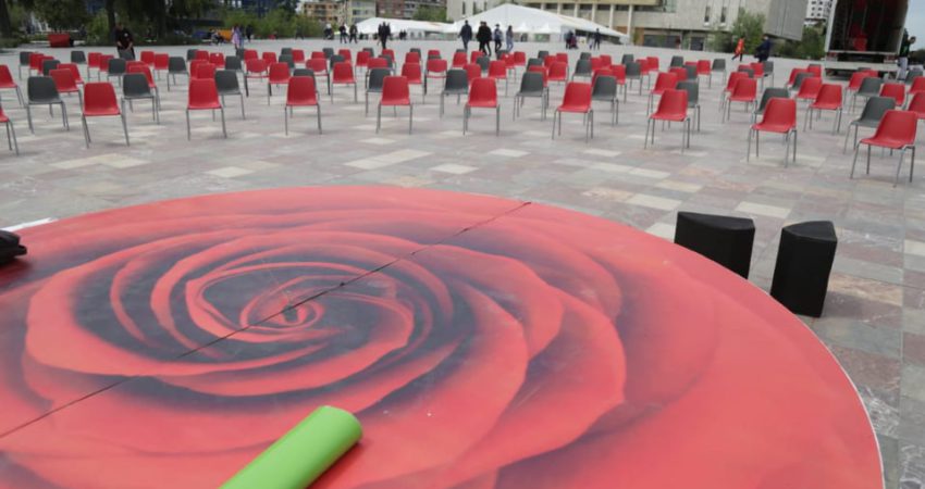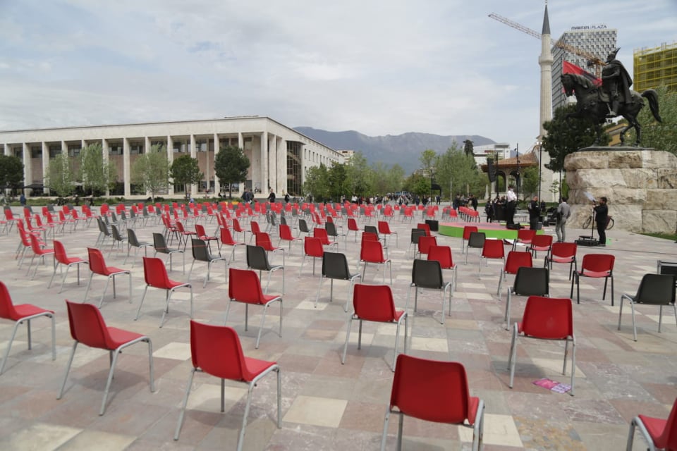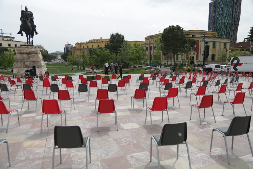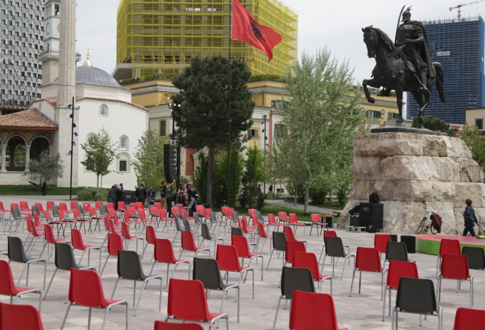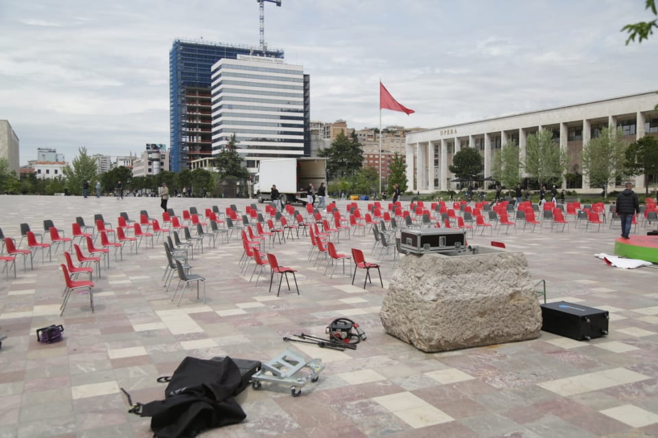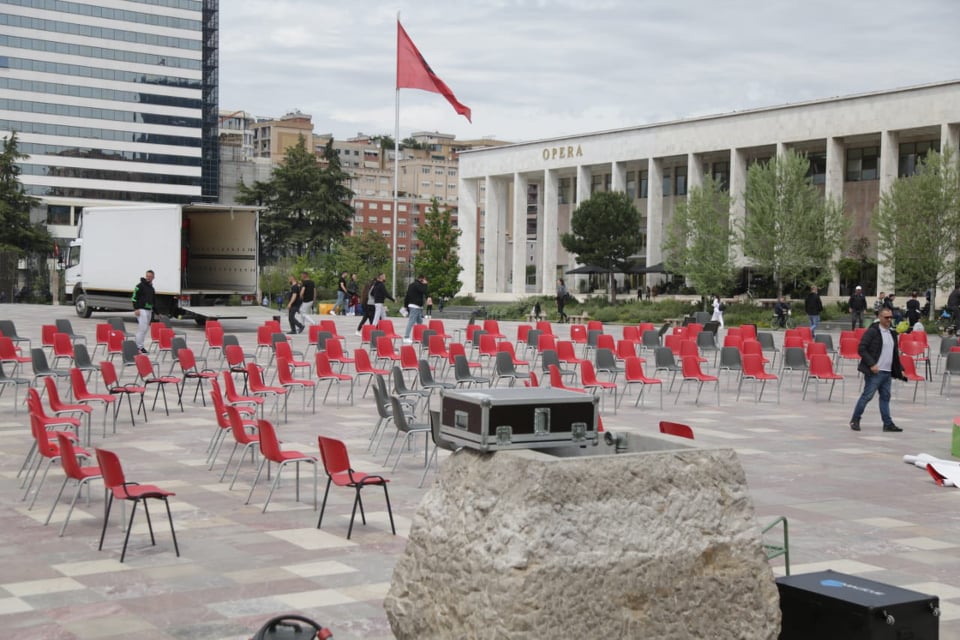 Fotografi nga përgatitja e mbledhjes së partisë socialiste të lajmëruar më herët nga kryeministri Edi Rama. Në një status në rrjetin social “Facebook” Rama shkriu se të martën në orën 18.00, në Sheshin “Skënderbej”, skuadra e Partisë Socialiste, duhet të mblidhet për të festuar fitoren.