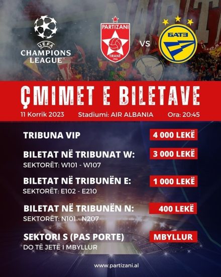 Gazeta Si – Partizani ngre të martën siparin europian për skuadrat shqiptare. Kampionët e Superiores ndeshet të martën në mbrëmje (ora 20:45) me kampionët e Bjellorusisë, Bate Borisov. Ndeshja luhet në stadiumin ‘Air Albania’ dhe klubi kryeqytetas ka publikuar edhe çmimet e biletave për çdo sektor.