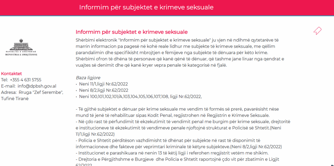 Nga Gazeta Si- Pas më shumë se 3 vitesh miratim nga kuvendi dhe 12 vitesh kërkesa nga organizatat, në Shqipëri është krijuar Regjistri Kombëtar i të dënuarve për krime seksuale.
