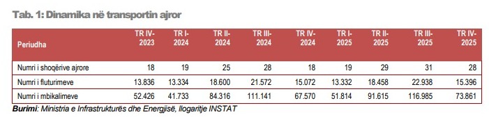 Gjatë tremujorit të katërt të vitit 2025, në transportin ajror operuan 28 shoqëri ajrore, pothuajse të gjitha të huaja, ndërsa vetëm një ishte shqiptare. Hapësira ajrore shqiptare u përshkua kryesisht nga fluturime tranziti, ndërsa numri i pasagjerëve që udhëtuan me linja ajrore shënoi një rritje vjetore gati 10%.