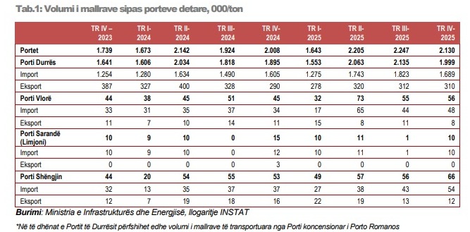 Në transportin detar, porti i Durrësit mbetet nyja kryesore për mallrat, duke përqendruar pothuajse të gjithë volumin e transportuar me det. Rritja e volumit të mallrave ishte e moderuar, ndërsa llojet kryesore të mallrave vijuan të jenë produktet e naftës, metalet dhe materialet minerale.