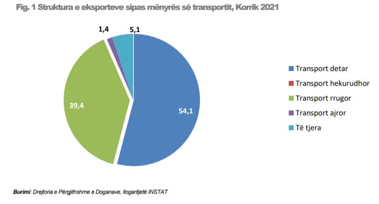Në Korrik 2021, mallrat e eksportuara me det zënë 54.1%, me rrugë 39.4% dhe me ajër 1.4%. Mallrat e eksportuara me rrugë në Korrik 2021 janë rritur me 21. %, krahasuar me Korrik 2020.