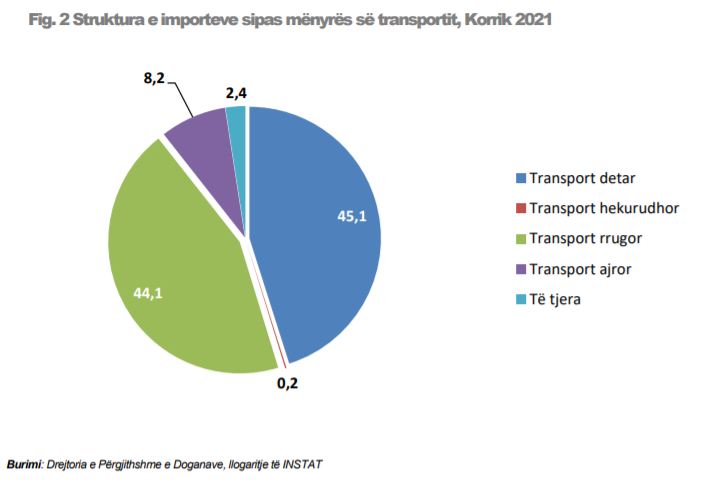 Në Korrik 2021 mallrat e importuara me det zënë 45.1%, me rrugë 44.1% dhe me ajër 8.2%. Mallrat e importuara me rrugë në Korrik 2021 janë rritur me 16.5%, krahasuar me Korrik 2020.