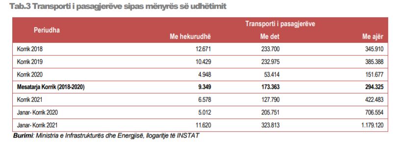 Udhëtimi nga deti raportohej në rënie që nga viti 2018 deri me 2020-n dhe shënoi rritje gjatë gjithë 7 mujorit të parë të 2021-shit. Gjithsesi, pjesa më e madhe e transportit civil vazhdon t’i përkasë lëvizjes nga ajri, 75.9% e të gjithë transportit. Për korrikun e këtij viti, me linjë ajrore udhëtuan 422.483 pasagjerë, me rritje 2.8 herë.