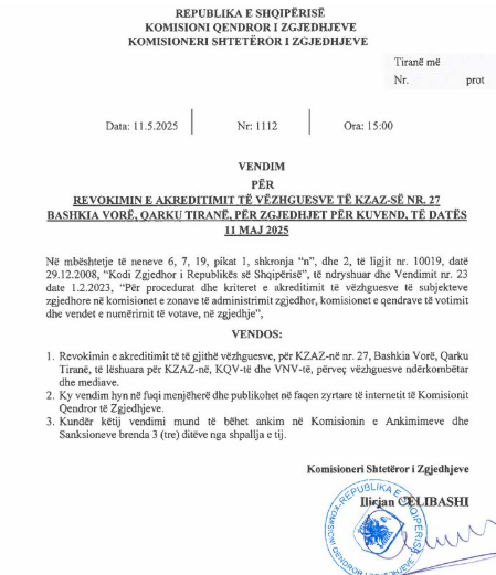 Në dokumentin e publikuar, KQZ ka vendosur “Revokimin e akreditimit të të gjithë vëzhguesve, për KZAZ-në nr. 27, Bashkia Vorë, Qarku Tiranë, përveç vëzhguesve ndërkombëtar dhe mediave”.