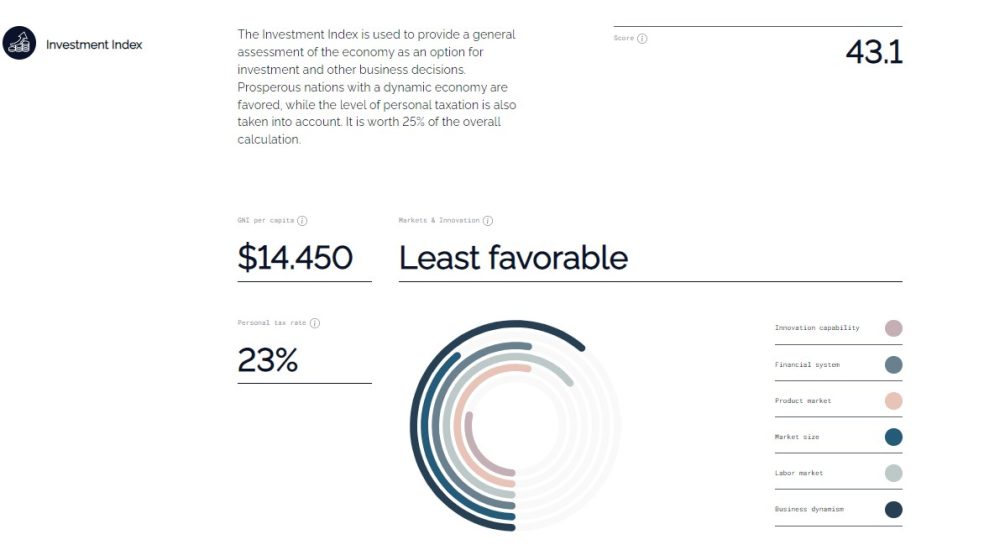 Të ardhurat kombëtare vjetore bruto për frymë raportohen në 14.450 dollarë dhe taksimi mbi të ardhurat personale prej 23%, kanë ndikuar në pikëzimin e ulët prej 43% në indeksin e investimeve, renditur në vendin e 110-të. Dinamikat e biznesit kanë pikëzimin më të lartë, ndërsa kapaciteti për inovacion, atë më të ulët.