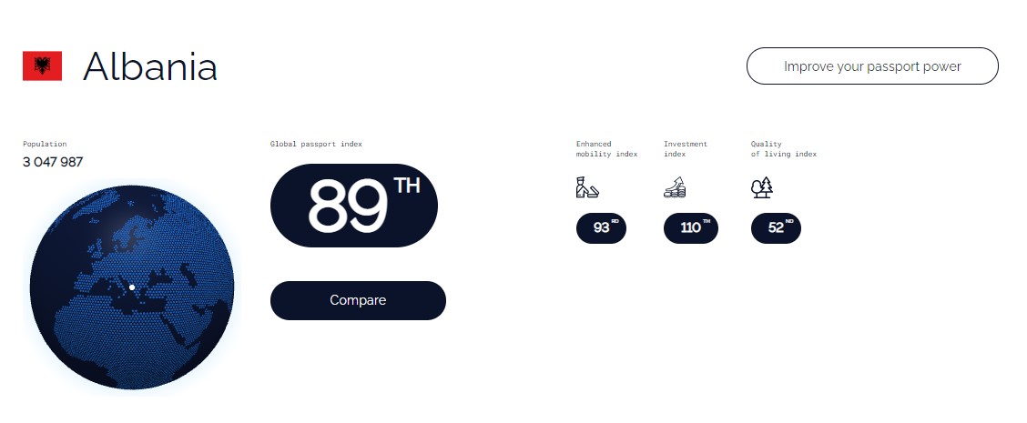 Në indeksin global të pasaportave më të rëndësishme, ajo shqiptare renditet e 89-ta për vitin 2022, nga 199 vende , duke u cilësuar si ndër më pak të preferuarat. Sipas GPI-së, kjo pasaportë i jep poseduesëve të saj, 50% të benefiteve që jep një dokument i tillë dhe vetëm për këtë shkak renditet e 93-ta. Me pasaportën shqiptare mund të udhëtosh në 122 vende.