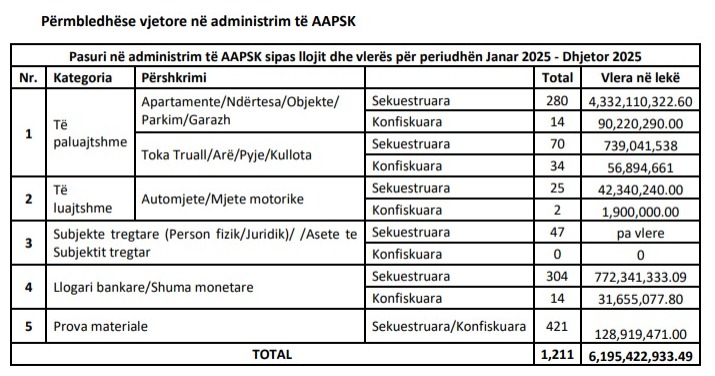 Në 12 muajt e vitit 2025, AAPSK ka administruar 1.211 pasuri, me një vlerë totale mbi 6 miliardë lekë, ku njësitë e banimit mbajnë vlerën më të madhe.