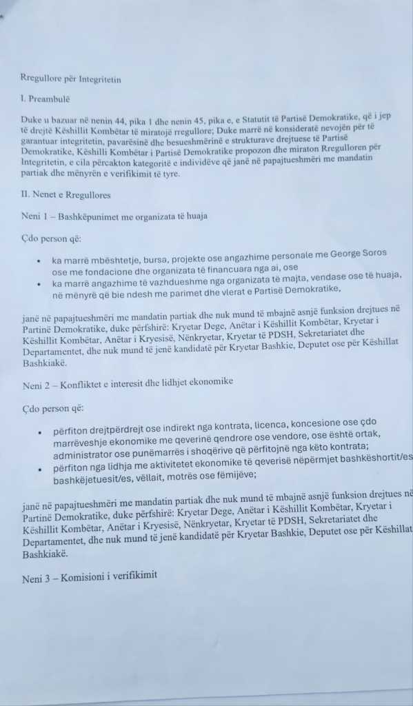 Ajo ka të bëjë me “desorifikimin” e PD dhe kërkohet që të largohen nga PD të gjithë ata individë që është vërtetuar që kanë përfituar ose kanë qenë pjesë e tenderave të dhëna nga qeveria Rama. Do të shihet nëse do miratohet nga Këshilli Kombëtar apo jo.