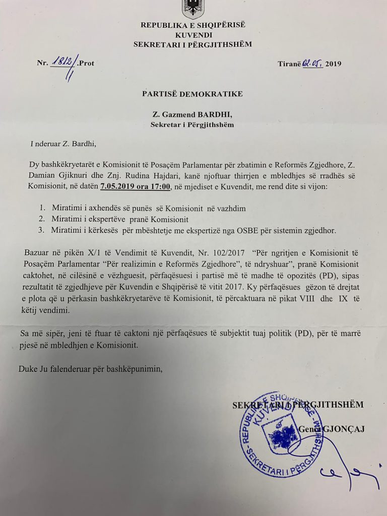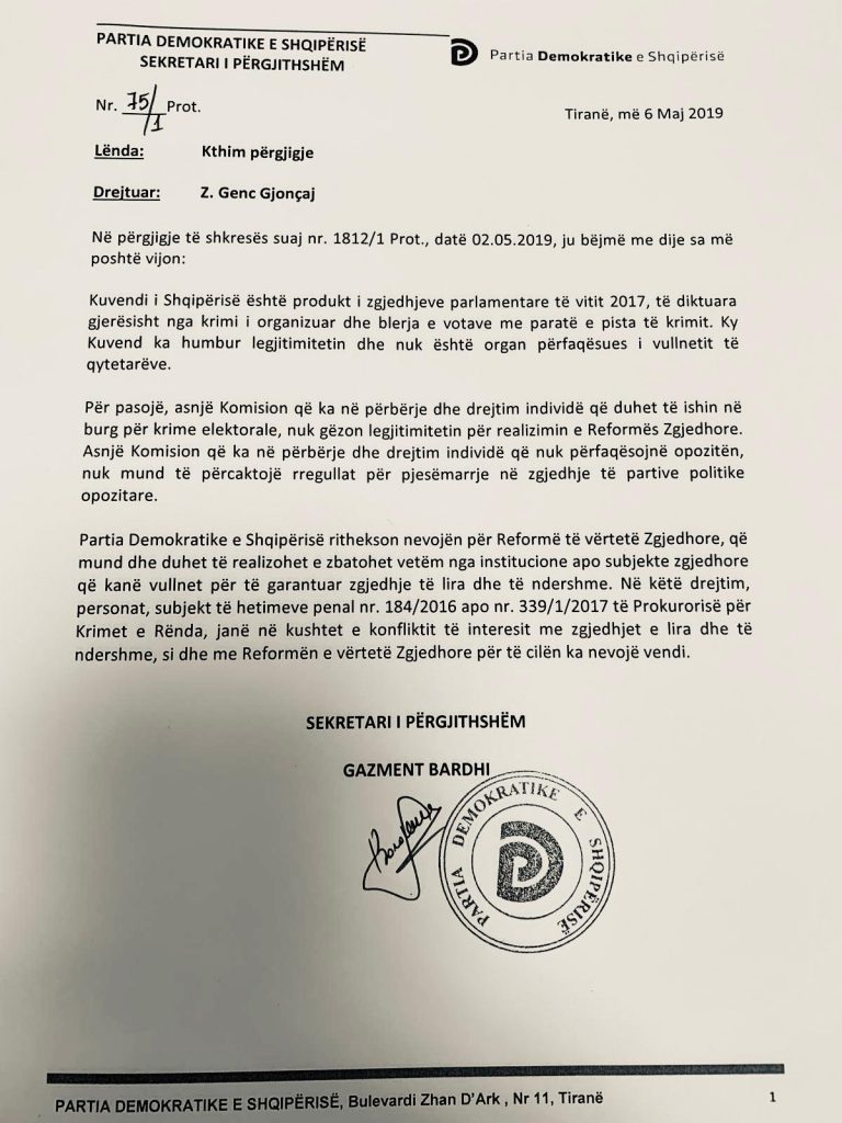 Partia Demokratike refuzon dërgimin e një vëzhguesi pranë komisionit të posaçëm për reformën zgjedhore. Sekretari i Përgjithshëm i PD-së, Gazment Bardhi i është përgjigjur shkresës së Kuvendit të Shqipërisë për caktimin e një vëzhguesi për të realizuar ndryshimet e Kodit Zgjedhor, pasi e konsideron këtë strukturë të posaçme, njësoj si Parlamentin “pa legjitimitet dhe produkt të zgjedhjeve të diktuara gjerësisht nga krimi i organizuar dhe blerja e votave me paratë e pista të krimit”.
