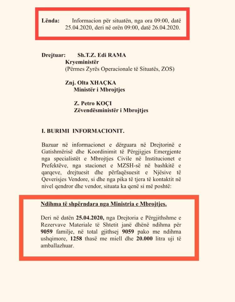 Në fakt, në dokumentin e bërë publik nga PD-ja, në krye të faqes flitet për një informacion 24-orësh, konkretisht të dhënat e shpërndarjes së ndihmave nga data 25 deri në datë 26 prill.