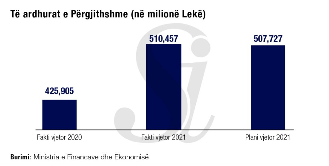 Sipas të dhënave zyrtare nga Ministria e Financave dhe Ekonomisë për të gjithë vitin 2021 të ardhurat totale u realizuan në masën 510 miliardë lekë, ose 101 % të planit vjetor. Krahasuar me një vit më parë të ardhurat janë rritur me 84.5 miliardë lekë ose me 20%, ndërsa krahasuar me vitin 2019 u rritën me 50 mld lekë ose me 11 %.