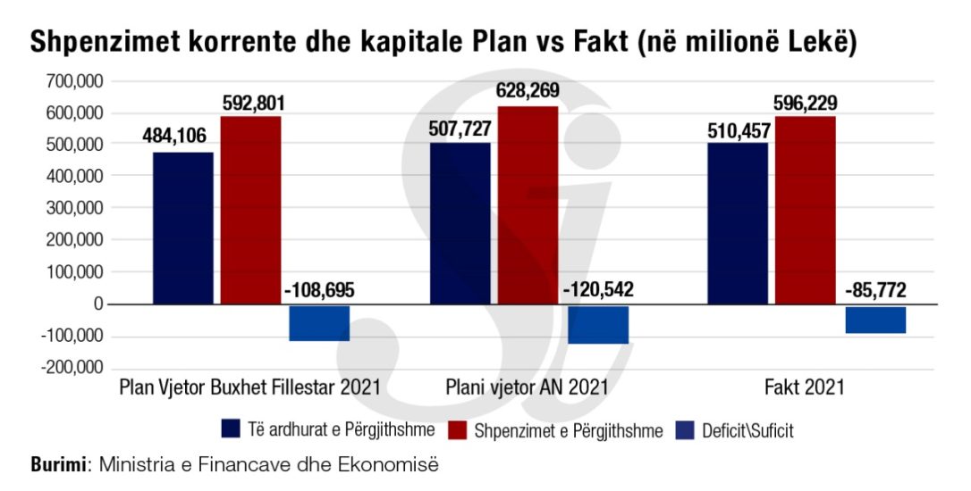 Niveli i deficitit për vitin 2021 rezultoi në rreth 85.8 miliardë lekë, ose rreth 24.8 miliardë lekë më pak se një vit më parë.