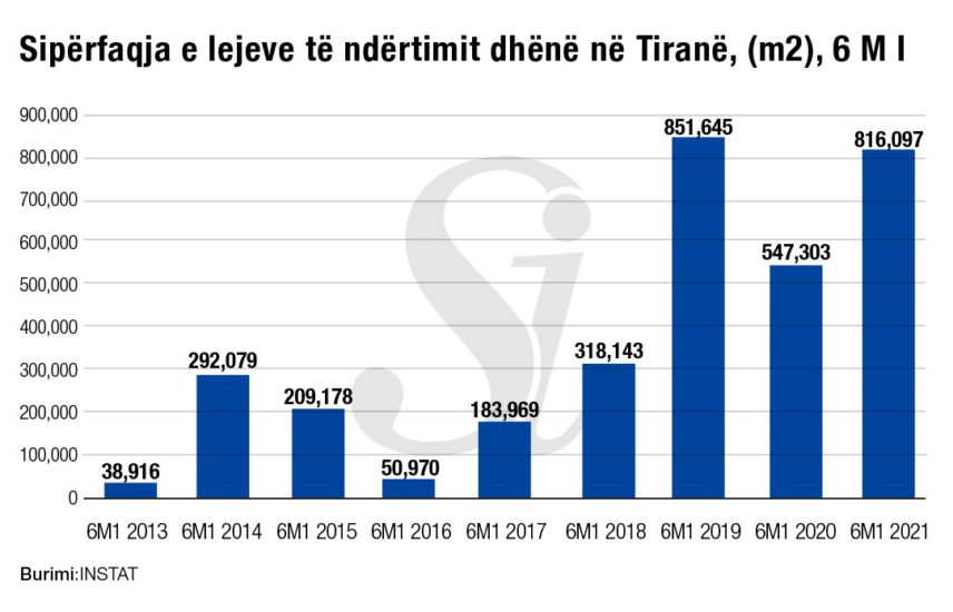 Në 6-mujorin e parë 2021, sipërfaqja e re për ndërtim në të gjithë vendin ishte 15% më e lartë se rekordi i tremujorit të tretë 2019, ndërsa në Tiranë ishte -4.2 më i ulët.