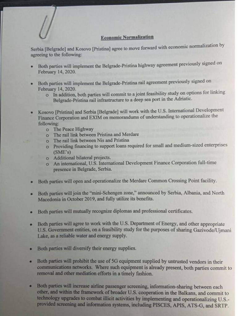 Në marrëveshjen e nënshkruar nga kryeministri Avdulla Hoti dhe presidenti Aleksandër Vucic, theksohet se të dyja palët pajtohen të vazhdojnë përpara me normalizimin e marrëdhënieve ekonomike. Ajo përcakton se: