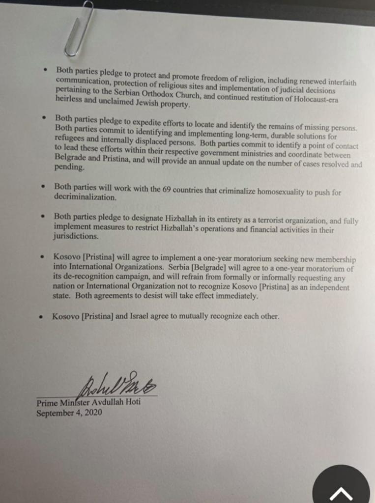 Ndërsa, pika e fundit, Kosova dhe Izraeli janë pajtuar që të njohin njëra-tjetrën. Dy vendet do konsiderojnë organizatën Hezbollah terroriste.