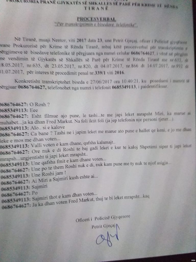 “…Nga përgjimet e telefonave celularë në përdorim të shtetasit Gjevi Ndoka evidentohet se ky shtetas në bashkëpunim me persona të tjerë, si para dhe gjatë fushatës zgjedhore është përfshirë në mënyrë aktive duke ofruar dhe dhënë të holla (para) zgjedhësve për të votuar kandidatët për deputetë nën siglën e Partisë Socialiste, të dhëna këto që dalin nga përgjimet,” shkruhet në dosjen hetimore.
