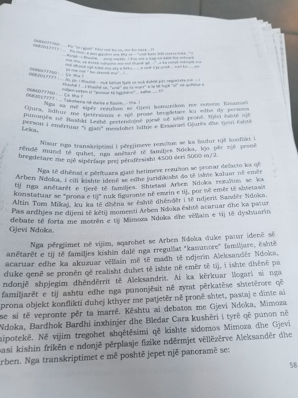 Në një pjesë të tyre prokuroria thotë se kuptohet qartë që ka patur një konflikt edhe mes vetë vëllezërve për pronësinë e 5 dynymëve tokë në zonën bregdetare. Arben Ndoka, thotë Prokuroria, ishte pronar de fakto i kësaj prone dhe pandehte se edhe juridikisht, familjarët e tij që punonin në hipotekë e kishin kaluar në emër të tij.