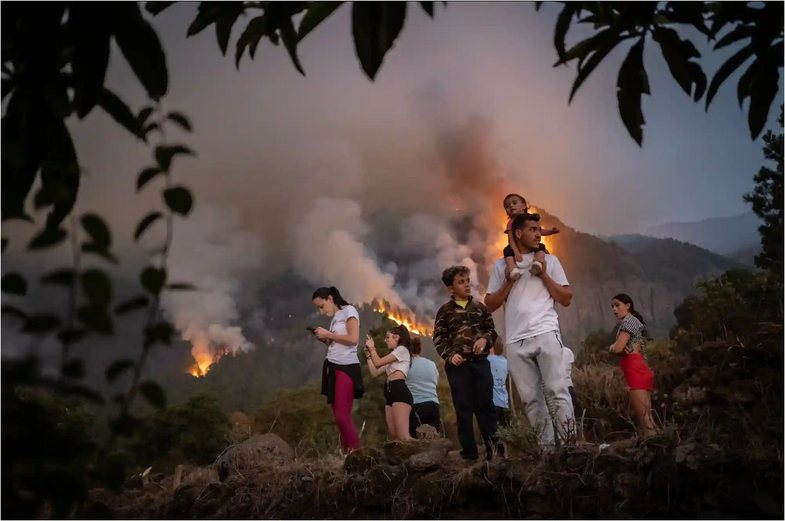 Njerëzit nga qyteti Aguamansa bëjnë fotografi të një zjarri të pakontrolluar në mal. Më shumë se 7,500 njerëz janë evakuuar ose janë urdhëruar të qëndrojnë brenda pasi zjarri më i keq në të paktën katër dekada shkatërroi ishullin.
