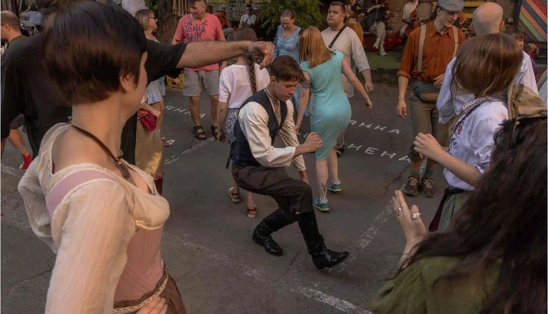 Njerëzit kërcejnë ndërsa muzikantët luajnë muzikë popullore në një lokal, Kiev
