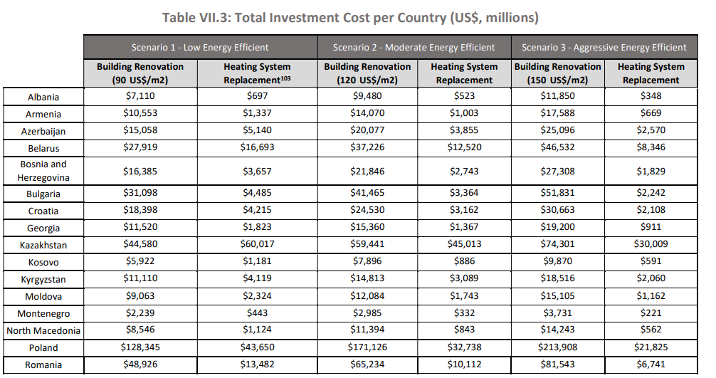 Në skenarin final, ‘eficiencë agresive e energjetike’ rikonstruktimi  i banesave do t’i kushtonte Shqipërisë 11.9 mld dollarë dhe sistemi i ri i ngrohjes 348 mld dollarë.