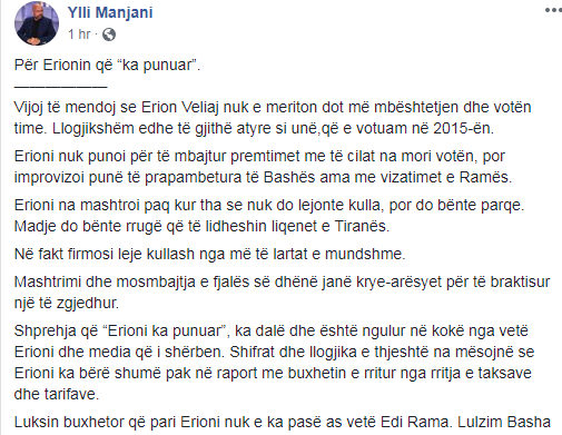 “Vijoj të mendoj se Erion Veliaj nuk e meriton dot më mbështetjen dhe votën time. Llogjikshëm edhe të gjithë atyre si unë, që e votuam në 2015-ën. Erioni nuk punoi për të mbajtur premtimet me të cilat na mori votën, por improvizoi punë të prapambetura të Bashës, por me vizatimet e Ramës. Erioni na mashtroi paq kur tha se nuk do lejonte kulla, por do bënte parqe. Madje do bënte rrugë që të lidheshin liqenet e Tiranës. Në fakt firmosi leje kullash nga më të lartat e mundshme. Mashtrimi dhe mosmbajtja e fjalës së dhënë janë krye-arësyet për të braktisur një të zgjedhur”, shkruan Manjani.