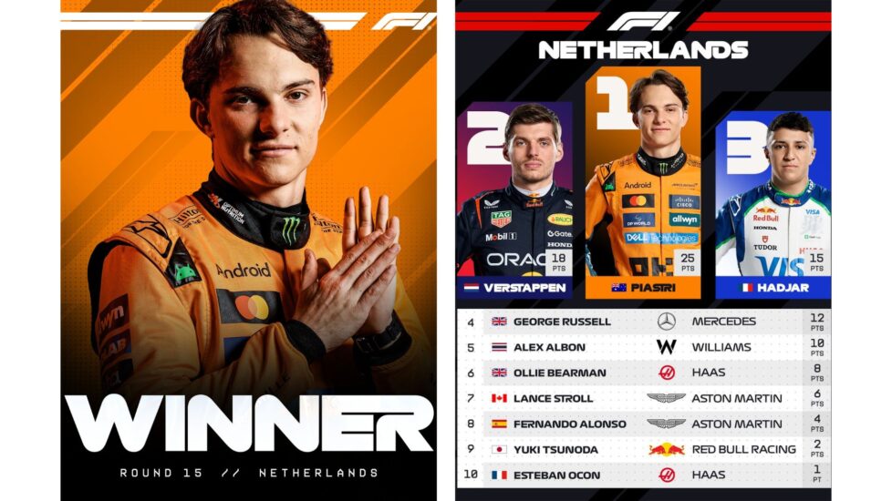 Tani australiani ka një diferencë prej 34 pikësh nga Norris në klasifikimin e pilotëve. Verstappen e mbylli garën në vendin e dytë, ndjekur nga Racing Bulls i Isack Hadjar që konvertoi vendin e 4 në podium e parë të karrierës së “rookie-t”.