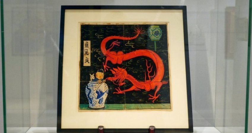 Ilustrimi u pikturua duke përdorur bojëra uji dhe tregon personazhin Tintin dhe qenin e tij Snowy duke u fshehur në një kavanoz prej porcelani.
