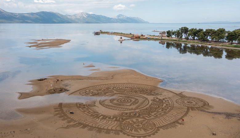 Artisti Nikola Faler, duke punuar në vizatimin e rërës në grykëderdhjen e lumit Neretva gjatë festivalit të 7-të të artit Zen Opuzen në Opuzen, Kroaci. REUTERS /Fotografi: Antonio Bronic