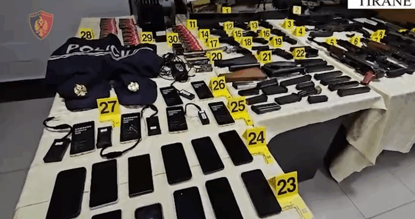 Më konkretisht, 12 janë pistoleta të llojeve “Beretta”, “Glock”, “Rex Delta”, “Ruger-57” dhe “Tanfoglio”; 6 armë automatike; 5 armë me tytë të gjatë (me shënjestër optike, të ngjashme me snajper); 1 silenciator; 17 krehra për armë zjarri të ndryshme; pjesë të ndryshme armësh zjarri; 15 000 fishekë; 17 kuti me pranga të ngjashme me ato që përdoren nga Policia; 12 celularë dhe pajisje që përdoren për shpërthime në distancë; pajisje elektronike gjurmuese (GPS); pajisje për bllokimin e valëve; pajisje për numërimin e kartëmonedhave; 3 komplete uniformash të ngjashme me ato të Policisë.