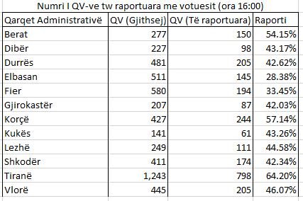 Nga 5.199 qendra votimi në total në Shqipëri, KQZ-ja ka raportuar  rreth orës 17:00 të 25 prillit vetëm 2.472 të tilla, pra  më pak se gjysma, 47.5% e masës totale.
